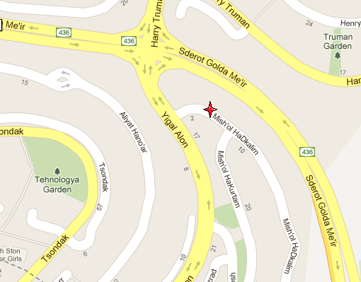 - At the third traffic light, Rechov Yigal, make a left and then make an immediate left at the guard booth to Mishol Hadekalim